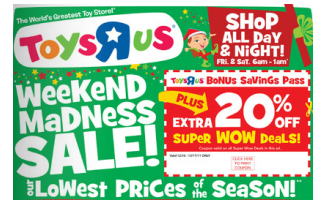 Toys R Us is having a Weekend Madness Sale Friday, 12/16 and Saturday, 12/17 – Lowest Prices of Season Plus An Extra 20% off!!