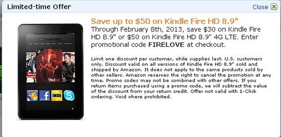Right now get Kindle Fire HD 8.9″, Dolby Audio, Dual-Band Wi-Fi, 16 GB – Includes Special Offers BY CLICKING HERE for only $249 + FREE shipping after entering promo code “FIRELOVE”.