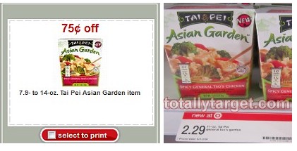 You can snag a sweet Target Coupon Deal this week. The Tai Pei Asian Garden Entrees are on sale for $2.29 and between the store coupon and the manufacturer coupon, you can snag one of these for ONLY $0.54!! Now that’s a HOT price!!