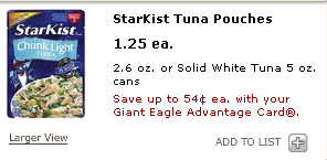 Buy Starkist Tuna Pouches, 2.6 oz. or Solid White Tuna 5 oz. cans – $1.25