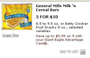 Use Save $.50/1 Lucky Charms Treats, Golden Grahams Treats, Chex Mix Treats or Milk ‘n Cereal Bars 1/8/12 GM (exp. 3/3/12)