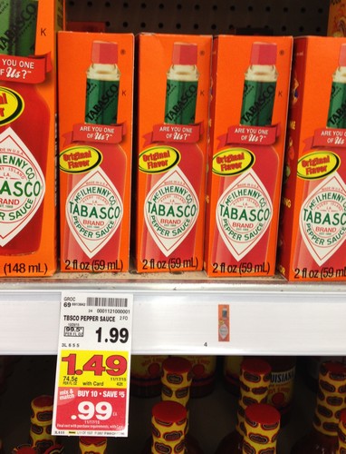 Kroger is having another Mega Event, buy 10, save $5 instantly (mix and match participating products) and the Tabasco Sauce is included for $0.99. In addition, we have a $0.50/1 Tabasco Sauce Printable Coupon making them ONLY $0.49. That’s a stock up price for sure :1)